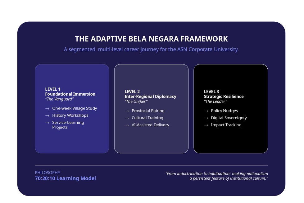 This raises an important question for Indonesia: can nationalism be taught, or must it be cultivated? The answer likely lies somewhere in between. Policies can create the structure, but it is repeated experience, habituation, that shapes identity. This is where the proposed multi level framework becomes compelling. By guiding civil servants through stages, from immersion to diplomacy to leadership, it attempts to transform nationalism from an abstract ideal into a professional ethic.
