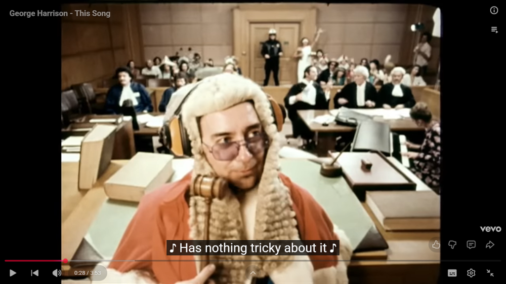 Uniknya, hal ini tidak menjadi masalah di kalangan dunia peradilan Inggris. Tidak ada yang tercatat dalam sejarah mempermasalahkan video klip lagu “This Song” milik Harrison ini. Coba bayangkan jika hal ini terjadi di Indonesia, apa yang kira-kira terjadi? Apalagi di era media sosial saat ini. Pasti sudah menjadi bulan-bulanan hujatan netizen. Hal ini menimbulkan satu pertanyaan besar, di manakah garis batas antara kebebasan berekspresi dengan wibawa Pengadilan?
