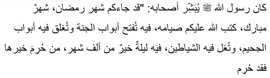 Artinya: “Rasulullah Saw memberi kabar gembira kepada para sahabatnya: ‘Telah datang kepada kalian bulan Ramadan, bulan yang penuh berkah. Allah telah mewajibkan atas kalian untuk berpuasa di dalamnya. Di bulan itu pintu-pintu surga dibuka, pintu-pintu neraka ditutup, dan setan-setan dibelenggu. Di dalamnya terdapat satu malam yang lebih baik daripada seribu bulan. Barang siapa terhalang dari kebaikannya, maka sungguh ia telah terhalang (dari kebaikan yang besar).”
