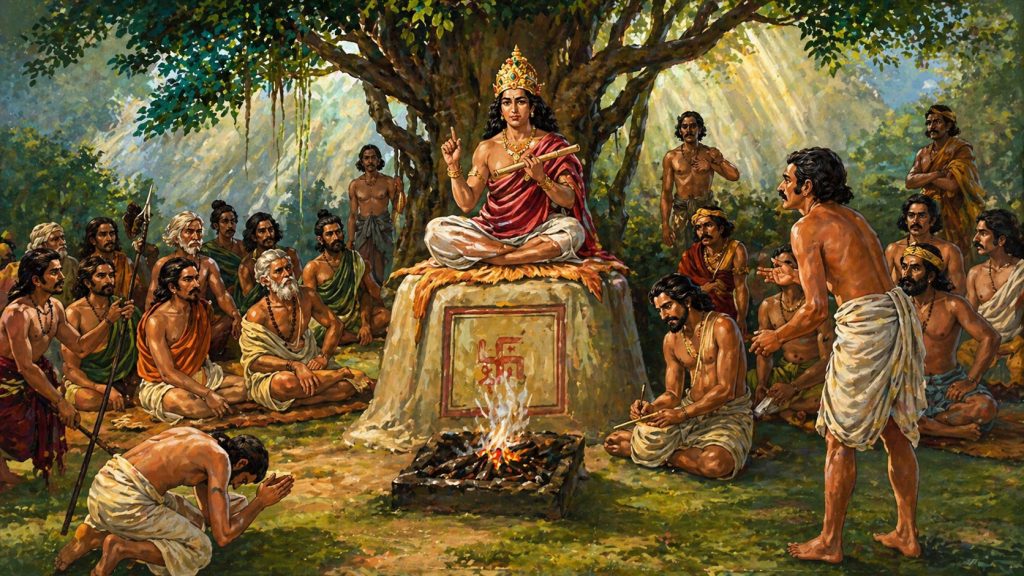 Jika dibaca lebih dalam, struktur visual lukisan itu sendiri mengandung pesan filosofis yang kuat. Ruang terbuka di bawah pohon mencerminkan gagasan bahwa keadilan harus dapat diakses dan disaksikan oleh masyarakat. Tidak adanya sekat fisik menjadi simbol keterbukaan dan transparansi. Posisi raja yang berada di pusat, namun tetap dikelilingi masyarakat, menunjukkan bahwa otoritas tidak berdiri dalam isolasi, melainkan berakar pada legitimasi sosial. Di sekelilingnya, masyarakat tidak hanya hadir sebagai penonton, tetapi sebagai bagian dari proses, ada yang berbicara, menyimak, dan menunjukkan sikap hormat. Bahkan elemen simbolik seperti api yang menyala di hadapan raja dapat dimaknai sebagai representasi kebenaran moral, bahwa keadilan tidak hanya bersandar pada aturan, tetapi juga pada nilai yang diyakini bersama.
