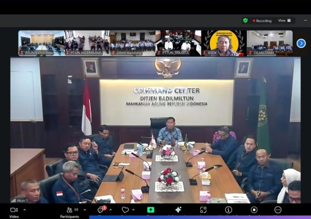 Direktur Jenderal Direktorat Jenderal Badan Peradilan Militer dan Tata Usaha Negara Mahkamah Agung RI, Marsekal Muda TNI Dr. Yuwono Agung Nugroho, S.H., M.H, kembali memimpin pembinaan rutin bagi seluruh satuan kerja Pengadilan Tata Usaha Negara (PTUN) dan Pengadilan Tinggi Tata Usaha Negara (PT.TUN) se-Indonesia. Kegiatan yang dilaksanakan secara daring ini menjadi forum konsolidasi bulanan untuk memastikan seluruh hakim dan aparatur peradilan tetap bekerja secara sungguh-sungguh, profesional, dan berintegritas.