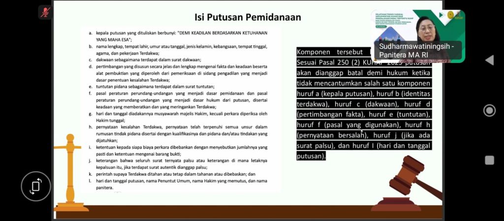 [5] Sudharmawatiningsih, Putusan (Pasal 250 s.d 254 KUHAP) dan Upaya Hukum, Pelatihan Teknis Yudisial Implementasi KUHAP dan Pendalaman Pasal Tertentu KUHP Bagi Hakim Peradilan Umum, Hakim Ad-Hoc Tipikor, Ad Hoc Perikanan, dan Hakim Mahkamah Syariah Aceh, Pusdiklat Teknis, Badan Strategi Kebijakan Dan Pendidikan Dan Pelatihan Hukum Dan Peradilan (BSDK) Mahkamah Agung RI, Dalam Jaringan (Daring), https://us02web.zoom.us/j/89566991856?pwd=a6ItfvLaPBs1CrqDP4ClPWCmucL3h4.1, diakses pada tanggal 6 Maret 2026, pukul 16.00 WIT.