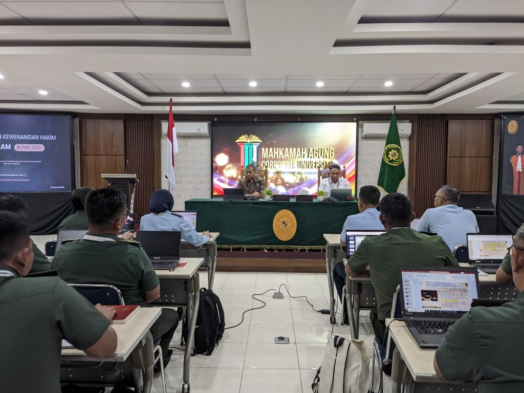 Pada hari Senin, 23 Februari 2026, diruang kelas Badan Strategi Kebijakan dan Pendidikan dan Pelatihan Hukum dan Peradilan Mahkamah Agung RI di Megamendung, Bogor, menjadi saksi berlangsungnya salah satu sesi penting dalam rangkaian Pelatihan Teknis Yudisial Implementasi KUHAP Baru bagi Hakim Tingkat Pertama Peradilan Militer Seluruh Indonesia.