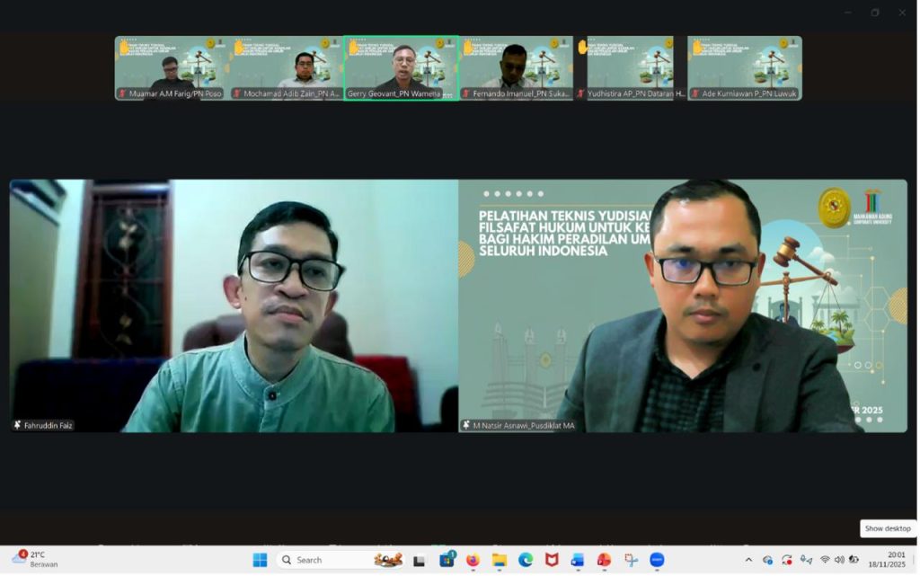 Narasumber yang mengisi pelatihan tersebut adalah Dr. Fahrudin Faiz, S.Ag., M.Ag., Dosen filsafat pada Universitas Islam Negeri Sunan Kalijaga Yogyakarta. Beliau juga dikenal luas sebagai pakar filsafat yang sering memberikan materi wejangan dan hal-hal lain terkait filsafat di kanal Youtube-nya. Kegiatan ini dimoderatori oleh M.Natsir Asnawi, Hakim Yustisial pada BSDK Mahkamah Agung Republik Indonesia.