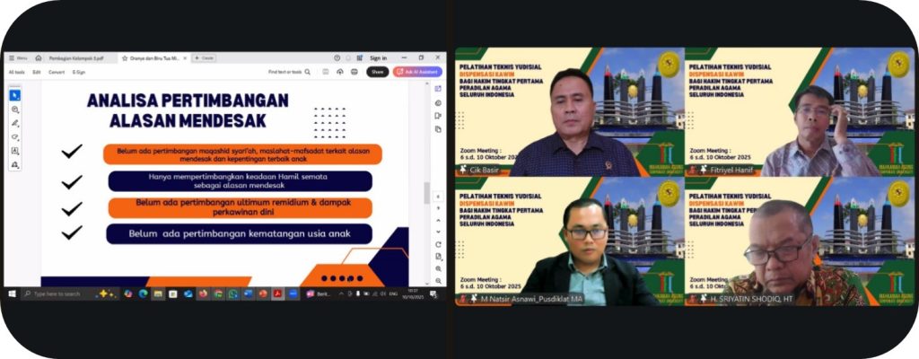 Merespons kondisi tersebut, penyelenggaraan pelatihan khusus bagi hakim Pengadilan Agama untuk menangani perkara permohonan dispensasi kawin menjadi sebuah keniscayaan yang mendesak. Pelatihan ini dirancang tidak hanya untuk memperkuat kompetensi hakim dalam aspek normatif-hukum belaka, melainkan juga membekali mereka dengan perspektif sosiologis, psikologis, dan etika yang kompleks dan inheren dalam setiap perkara dispensasi kawin. Dengan pendekatan multidisiplin ini, diharapkan hakim dapat menjalankan fungsi yudisialnya secara lebih profesional dan akuntabel, serta memastikan bahwa setiap penetapan yang dikeluarkan secara substantif menjamin perlindungan dan pemenuhan hak-hak anak sebagai prinsip utama.
