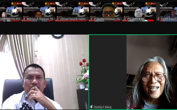 Filsuf Kontemporer Indonesia, Tommy F. Awuy (berkacamata) saat memberikan materi Filsafat pada Diklat Filsafat Hukum Untuk Keadilan Seri Ke-2 yang ditaja oleh Badan Strategi Kebijakan, Pendidikan dan Pelatihan Hukum Mahkamah Agung RI (Senin 1/12/2025)