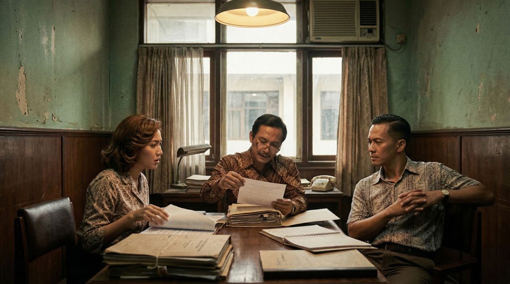 Ruang musyawarah itu terasa lebih penuh dari biasanya, padahal hanya ada tiga orang di dalamnya. Ketua majelis, Ravindra Karsa, duduk dengan berkas terbuka di depannya, kacamata sedikit turun dari posisi semula. Di sisi kanan, Elion Prasetra menyandarkan punggung, jari-jarinya saling terkait, sementara di sisi kiri Mahira Sadyana masih membalik halaman dengan ritme yang terlalu cepat untuk disebut membaca dan terlalu lambat untuk disebut sekadar melihat.
