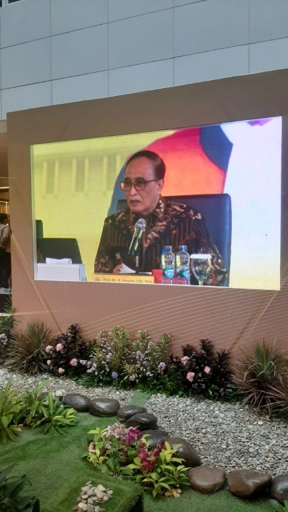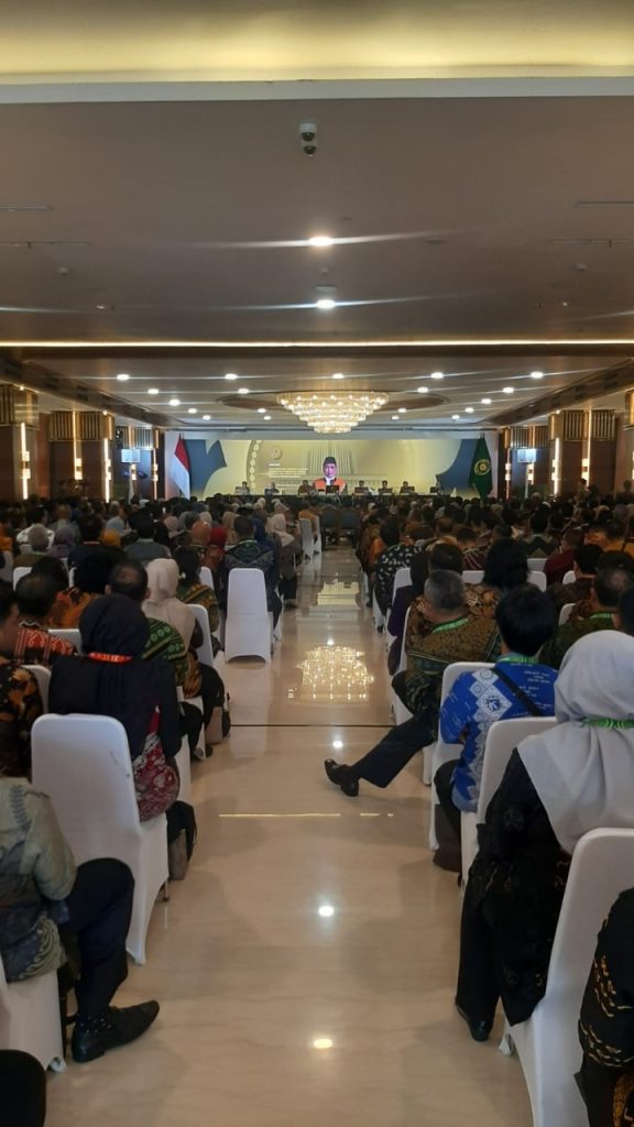Foto besar Ketua MA yang terpampang di layar utama memantulkan keteduhan, namun juga ketegasan. Dari podium, beliau menyampaikan bukan sekadar evaluasi kinerja, melainkan renungan etik tentang makna jabatan dan marwah peradilan. Suasana ruang—yang dipenuhi warna batik dan wajah-wajah penuh perhatian—menegaskan bahwa forum ini adalah momen penting dalam kalender peradilan.