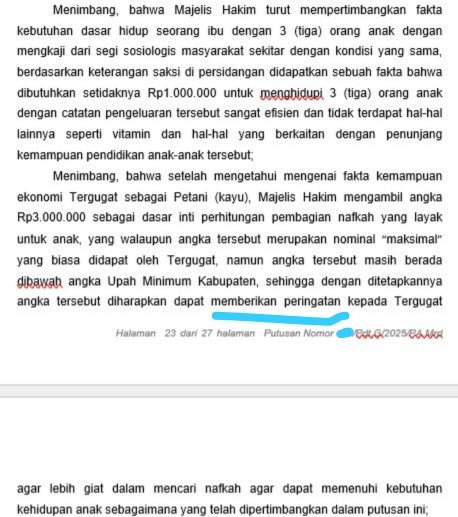 Dalam ranah yang lebih konkrit, kepelikan pembuktian nafkah bukanlah alasan untuk meniadakan keadilan. Dalam salah satu perkara yang ditangani Penulis, ketika ayah terbukti bekerja sebagai buruh harian lepas dengan penghasilan tidak tetap, penetapan nafkah dilakukan dengan mengkaji kebutuhan riil anak serta mengaitkannya dengan Upah Minimum Kabupaten. Dari dua indikator tersebut, ditetapkan nominal nafkah yang patut dan proporsional. Pendekatan ini tidak hanya menghadirkan keadilan bagi anak, tetapi juga kemanfaatan bagi ayah, karena putusan yang jelas dan terukur justru menghilangkan ruang penghindaran kewajiban serta dapat dijadikan sebagai bahan motivasi untuk pribadi.