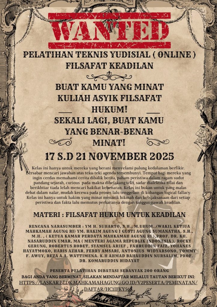 Pelatihan ini diharapkan menjadi ruang pengayaan wawasan dan refleksi intelektual dalam memaknai nilai keadilan dalam proses peradilan serta dinamika hukum di Indonesia.