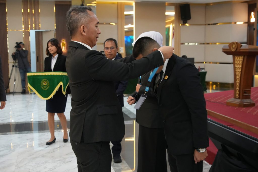 Di hadapan mereka, Kepala Badan Strajak Diklat Kumdil MA RI, Syamsul Arief, menegaskan arah. Latsar bukan hanya seremoni, melainkan batu loncatan menuju profesionalisme dan layanan publik yang bersih. Pernyataan itu segera diberi tanda mula lewat penyematan tanda peserta kepada dua perwakilan peserta pelatihan, Fakhira Alya Sabrina (PT Palembang) dan Marshall Tambajong (PTUN Manado)—gestur kecil yang menandai langkah besar.