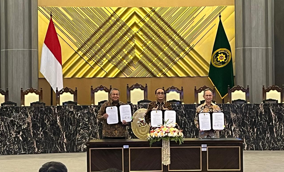 Acara strategis ini dihadiri secara langsung oleh pimpinan tertinggi ketiga lembaga negara, yakni Ketua Mahkamah Agung Republik Indonesia, Yang Mulia Prof. Dr. H. Sunarto, Gubernur Bank Indonesia, Perry Warjiyo, serta Ketua Dewan Komisioner Otoritas Jasa Keuangan, Mahendra Siregar. Kehadiran para pimpinan puncak tersebut menegaskan bobot dan makna penting Nota Kesepahaman sebagai wujud kesungguhan negara dalam membangun sinergi lintas mandat kelembagaan.