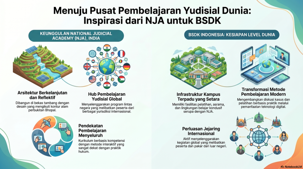 Menariknya, jika dicermati lebih dekat, sejumlah hal yang menjadi kekuatan NJA sebenarnya juga telah dimiliki oleh BSDK. Dari sisi infrastruktur, konsep kampus terpadu dengan lingkungan yang mendukung pembelajaran juga telah hadir di kawasan pelatihan Mahkamah Agung di Indonesia. Fasilitas seperti ruang pelatihan, asrama, hingga ruang diskusi menjadi bagian penting dalam proses belajar, sebagaimana yang terlihat di NJA.