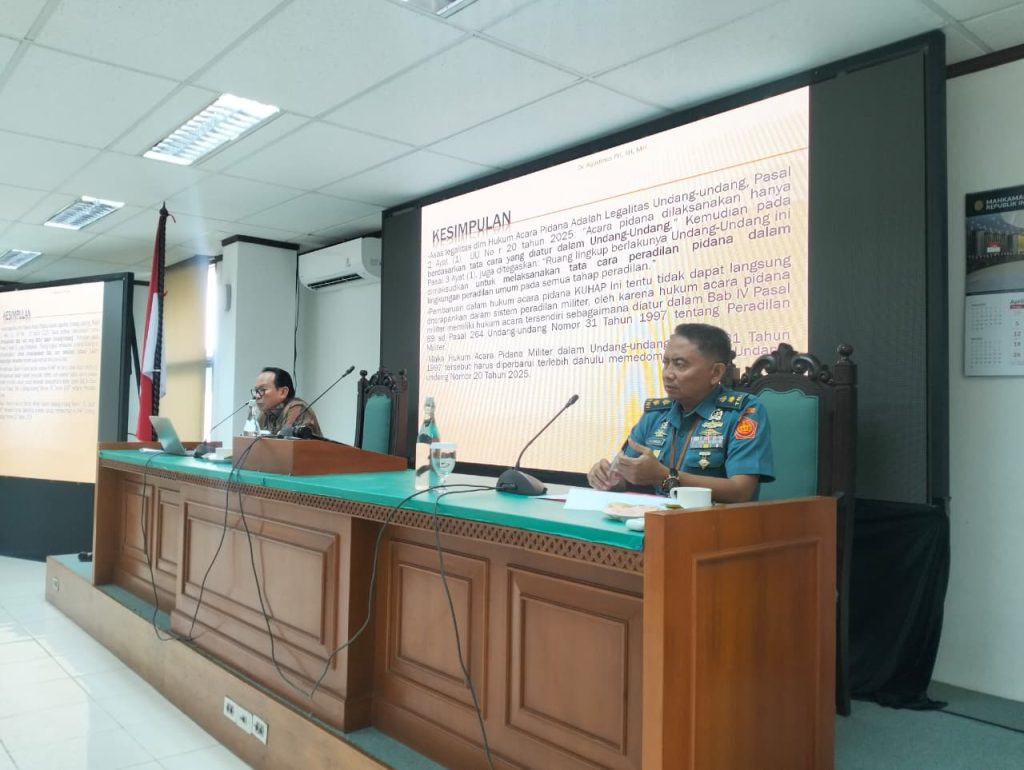 Dalam rangka menjawab persoalan tersebut, telah diselenggarakan Pelatihan Teknis Yudisial Implementasi Undang-Undang Peradilan Militer Pasca KUHAP Baru bagi Hakim Peradilan Militer Seluruh Indonesia pada hari Selasa, 20 April 2026 di Badan Strategi dan Kebijakan Diklat Hukum dan Peradilan (BSDK). Kegiatan ini menghadirkan Yang Mulia Bapak Dr. Agustinus PH, S.H., M.H., Hakim Agung pada Mahkamah Agung Republik Indonesia, yang menyampaikan materi mengenai Sistem Peradilan Pidana Militer dan Posisi KUHAP Baru. Dalam kegiatan tersebut, penulis bertindak sebagai fasilitator yang mengawal jalannya diskusi dan pendalaman materi.