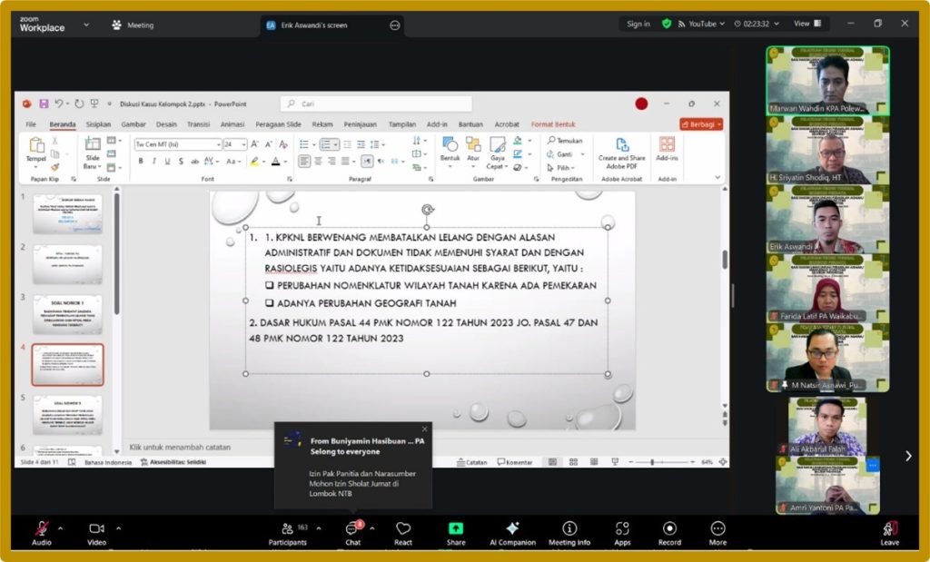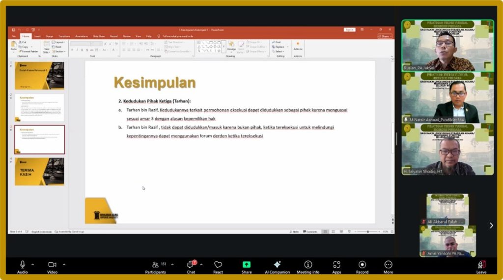 Lebih dari sekadar dialog satu arah, pelatihan ini berhasil menciptakan ruang berbagi yang konstruktif di mana para peserta dengan sukarela membuka pengalaman lapangan mereka masing-masing. Berbagai studi kasus nyata tentang kesulitan dalam menyelesaikan permasalahan eksekusi dibahas secara terbuka, mulai dari kendala teknis hingga hambatan non-teknis yang sering dihadapi. Pertukaran pengalaman ini tidak hanya memperkaya wawasan bersama, tetapi juga membangun koleksi best practices yang dapat dijadikan referensi dalam menangani kasus-kasus eksekusi di masa depan.