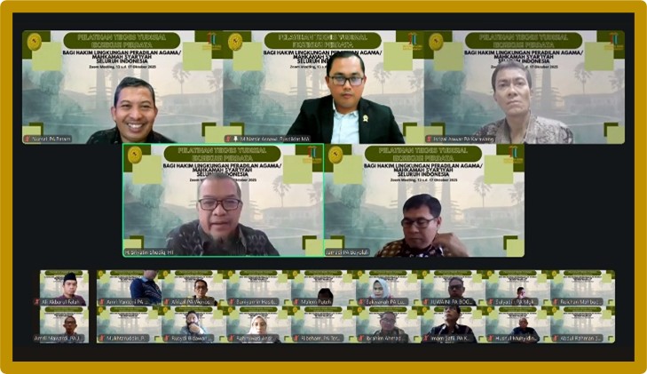 Selama sepekan, peserta menerima materi dari para narasumber dan difasilitasi langsung oleh para Hakim Tinggi/Hakim Yustisial Pusdiklat Teknis Peradilan, yaitu: Dr. H. Jarkasih, M.H. (Koordinator), Dr. H. Sriyatin, S.Ag., M.Ag., M.H.; Dr. Cik Basir, S.H., M.H.I.; Dr. Fitriyel Hanif, S.Ag., M.Ag.; Dr. Mardi Candra, S.Ag., M.Ag., M.H., dan Dr. M. Natsir Asnawi, S.H.I., M.H.