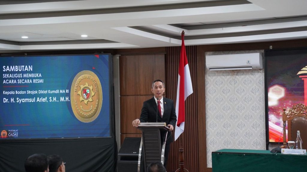 Usai laporan pelaksana, acara dilanjutkan dengan sambutan sekaligus pembukaan secara resmi kegiatanPendidikan dan Pelatihan (Diklat) Peradilan Niaga dan PKPU bagi Hakim Peradilan Umum oleh Kepala Badan Strajak Diklat Kumdil Mahkamah Agung RI (BSDK MA RI) Dr. H. Syamsul Arief, S.H., M.H. Dalam sambutannya, beliau menyampaikan selamat bagi para peserta yang terpilih untuk mengikuti kegiatan ini karena tidak semua hakim mendapatkan kesempatan mengikuti kegiatan Pendidikan dan Pelatihan (Diklat) Sertifikasi Peradilan Niaga dan Penundaan Kewajiban Pembayaran Utang (PKPU). Disamping itu, Kepala Badan BSDK menekankan bahwa pentingnya peningkatan kapasitas hakim dalam memahami hukum ekonomi modern serta peran strategis peradilan niaga dalam menciptakan iklim usaha yang adil dan kondusif.