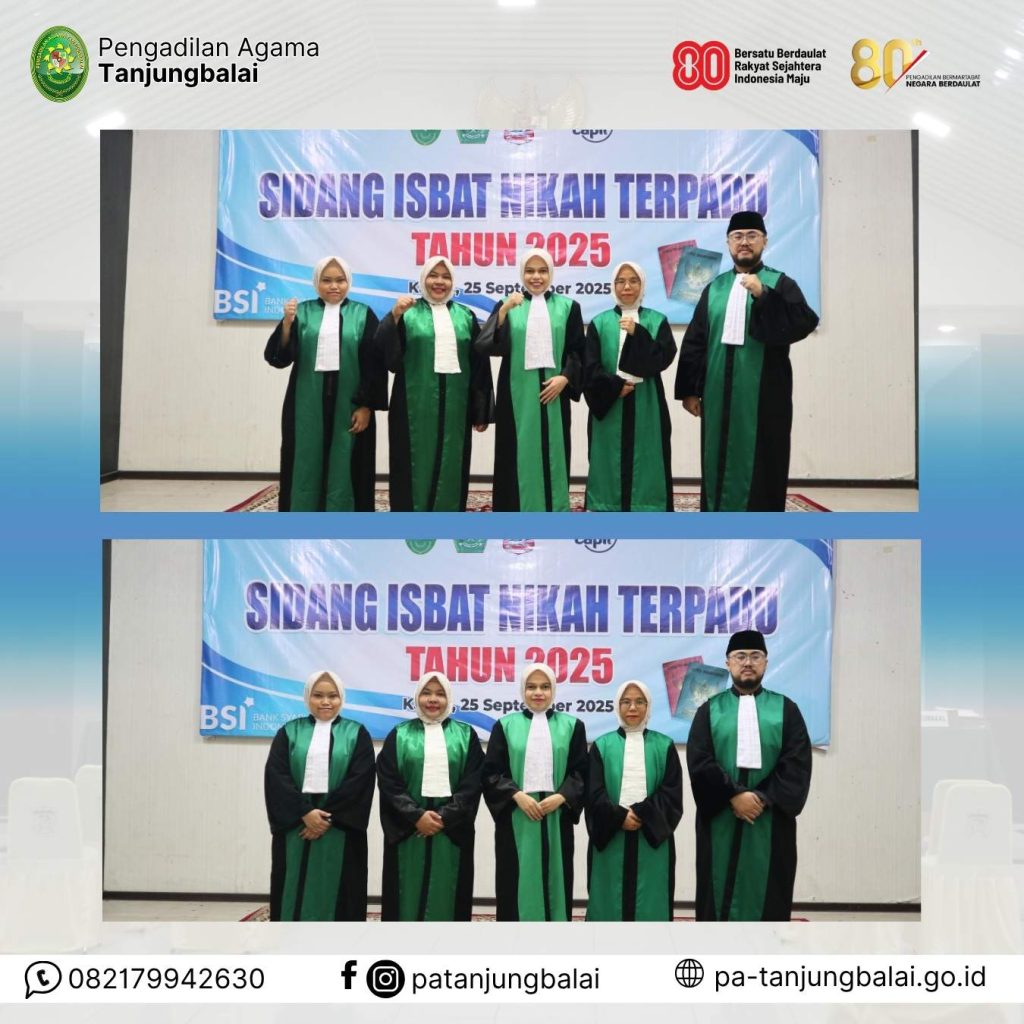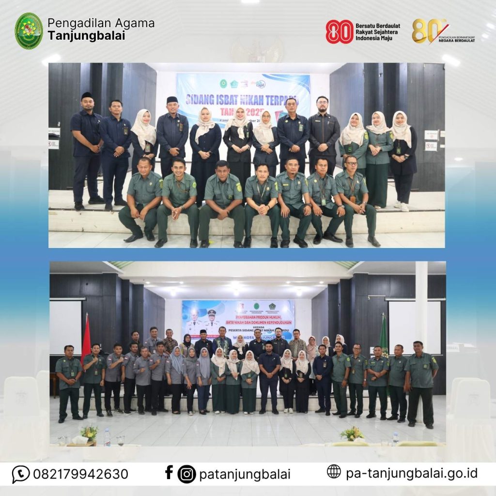 Pengadilan Agama Tanjungbalai sukses menyelenggarakan Pelayanan Istbat Nikah Terpadu Tahun 2025 pada Kamis, 25 September 2025 pukul 08.30 WIB, bertempat di Pendopo Rumah Dinas Wali Kota Tanjungbalai. Kegiatan berjalan dengan lancar dan penuh antusias dari para peserta maupun pihak terkait.