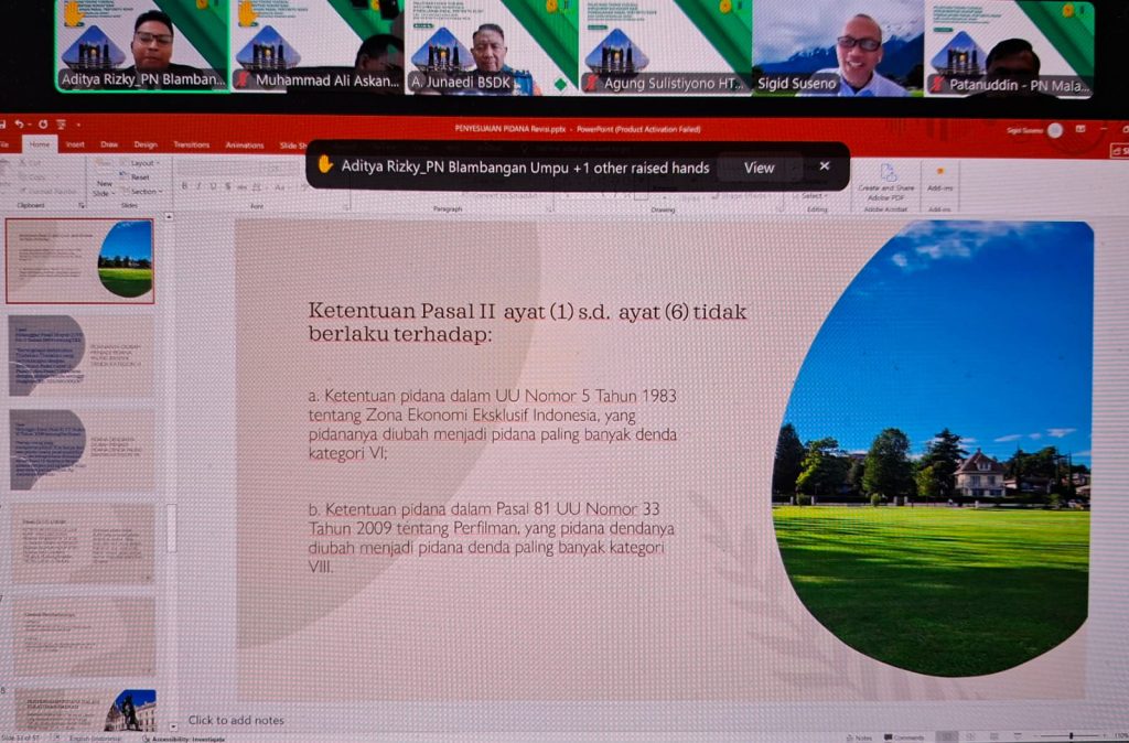 Dalam sesi yang saya fasilitasi, materi mengenai penyesuaian pidana disampaikan oleh Dr. Sigid Suseno, S.H., M.Hum., akademisi Fakultas Hukum Universitas Padjadjaran. Materi ini tidak hanya menjelaskan perubahan norma, tetapi secara langsung menyentuh persoalan mendasar: sejauh mana hakim siap menyesuaikan cara berpikirnya dalam menghadapi perubahan tersebut.