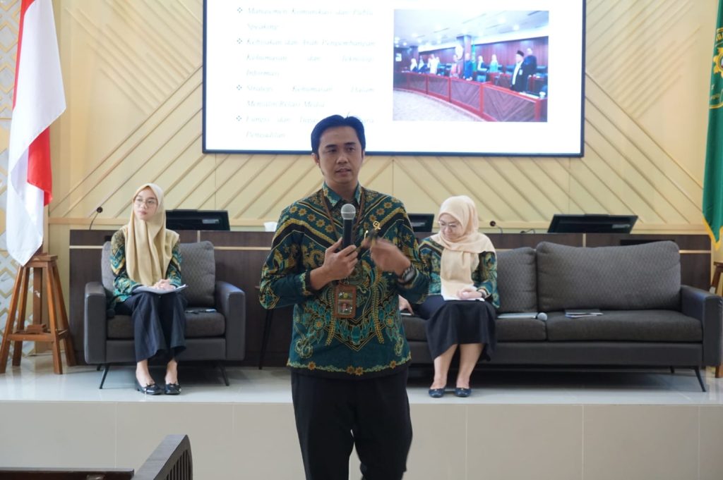 Sementara itu, narasumber kedua, Riki Perdana Raya Waruwu, Wakil Ketua Pengadilan Negeri Karawang, menyampaikan materi mengenai peran strategis juru bicara pengadilan. Ia mengingatkan bahwa setiap pernyataan yang disampaikan kepada publik mencerminkan wajah institusi.