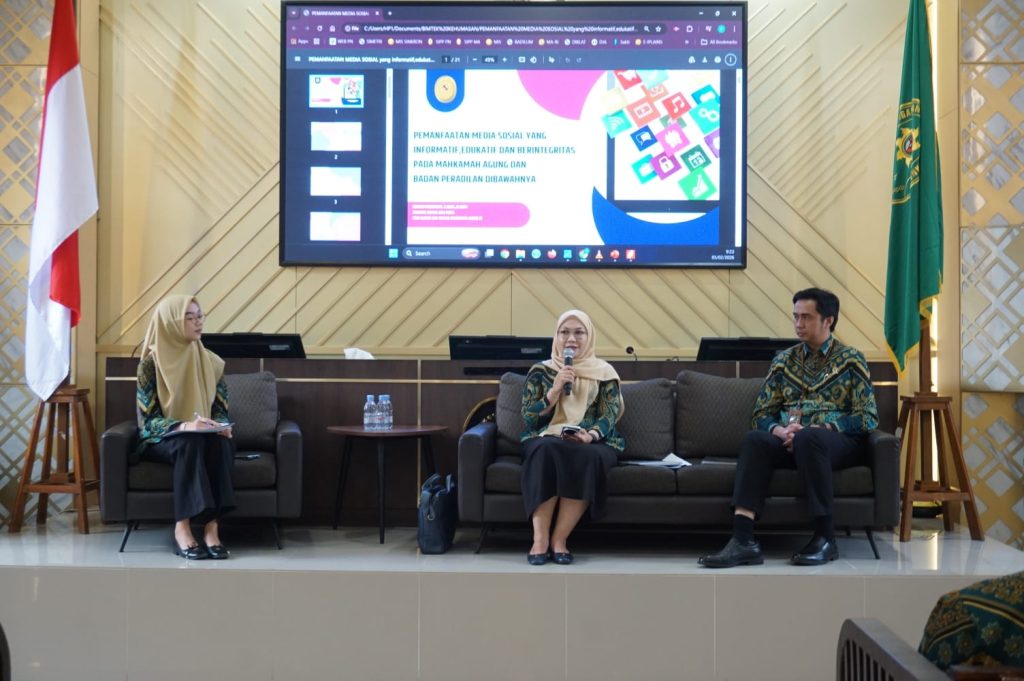 Narasumber pertama, Ishma Punawati, Pranata Humas Ahli Muda pada Biro Hukum dan Humas Mahkamah Agung Republik Indonesia, memaparkan strategi pengelolaan media sosial pengadilan.