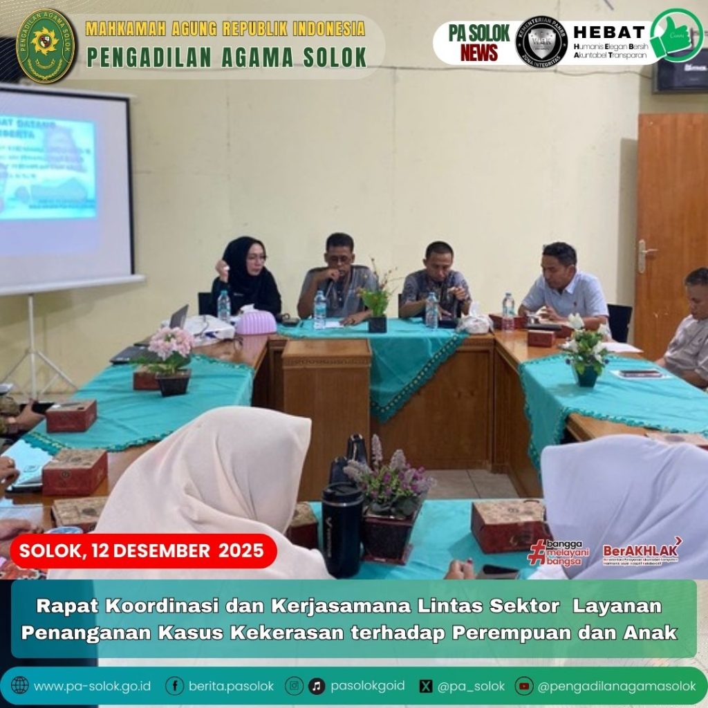 Solok,12/12/2025. Dinas Sosial, Pemberdayaan Perempuan dan Perlindungan Anak (DPPP3A) Kota Solok, menyelenggarakan Rapat Koordinasi dan Kerjasamana Lintas Sektor  terkait Layanan Penanganan Kasus Kekerasan terhadap Perempuan dan Anak, acara yang digelar di aula Belakang Gedung Kubuang Tigobaleh Kota Solok (12/12). Ketua Pengadilan Agama Solok YM. Nanang Soleman, S.H.I., didaulat memberikan materi tentang Perceraian dan Perkawinan  Anak.