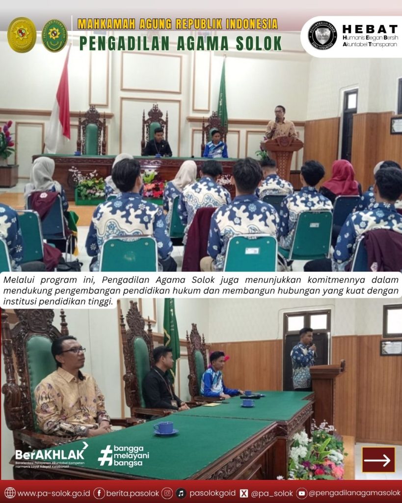 “Kami sangat menghargai kehadiran Anda semua di Pengadilan Agama Solok. Kami berharap pengalaman yang Anda dapatkan di sini akan menjadi bekal berharga dalam perjalanan profesional Anda,” ujar YM. Anshari Az-Zarqy, S.H., M.H.