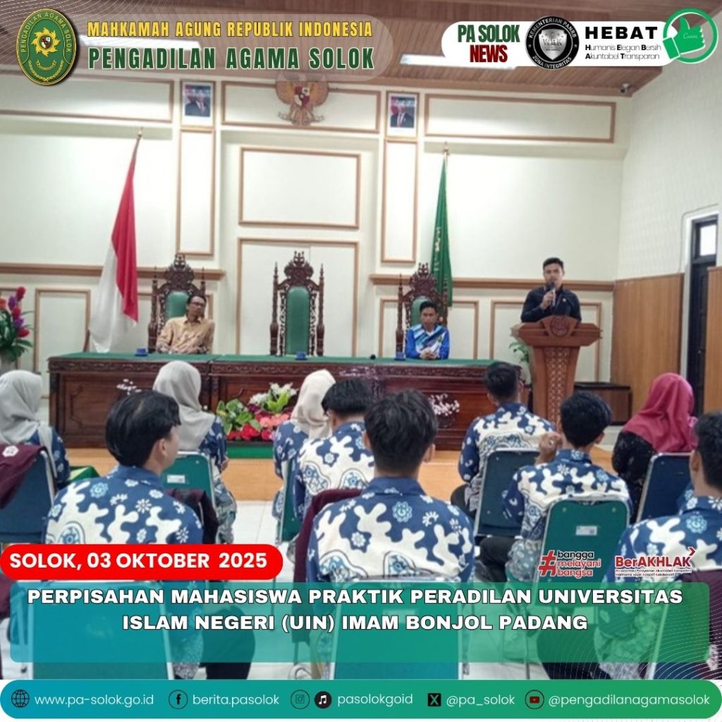 Jumat, 03/10/2025. Pengadilan Agama Solok menggelar acara perpisahan untuk mahasiswa magang dari Universitas Islam Negeri (UIN) Imam Bonjol Padang yang telah menyelesaikan program praktik peradilan yang berakhir pada 03 Oktober 2025. Acara ini dilaksanakan di aula Pengadilan Agama Solok dan dihadiri oleh Ketua Pengadilan Agama Solok yang diwakili oleh Hakim YM. Anshari Az-Zarqy, S.H., M.H., serta Sekretaris Pengadilan Agama Solok, Rahmel Fitri, S.E., S.H., M.M. Acara juga turut dihadiri oleh dosen pembimbing lapangan, Dr. Rahmad Hidayat, M.Ag.