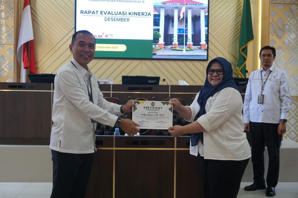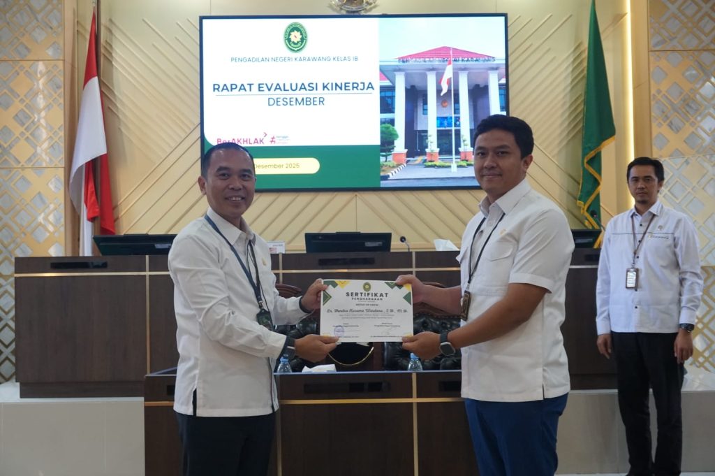 Karawang, 15 Desember 2025 — Pengadilan Negeri Karawang memberikan penghargaan kepada tiga hakim mediator atas kinerja dan kontribusinya dalam penyelesaian perkara melalui jalur mediasi. Penghargaan tersebut diserahkan dalam kegiatan rapat bulanan Pengadilan Negeri Karawang.