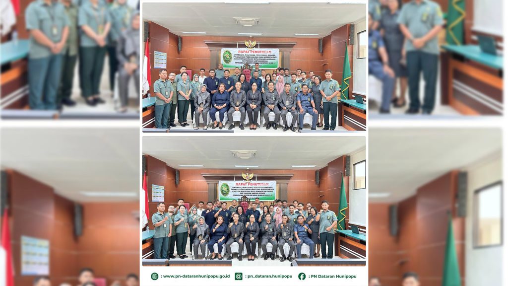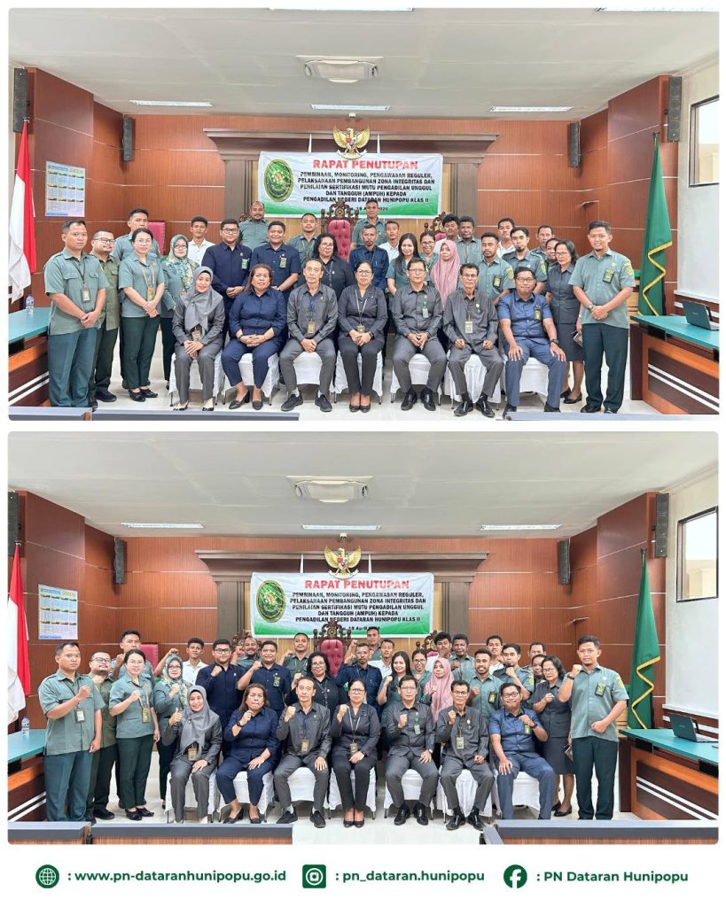 Pada akhir kegiatan juga dilakukan penutupan sekaligus penyampaian hasil dari penilaian tentang kelengkapan dokumen ZI dan AMPUH yang sudah lengkap dan cukup baik namun tetap terdapat catatan untuk dapat dilengkapi dan diharapkan dapat terus konsisten bahkan terus ditingkatkan agar menjadi lebih baik lagi, serta disampaikan bahwasanya kinerja PN Dataran Hunipopu tergolong unggul dalam memberikan pelayanan hukum bagi masyarakat pencari keadilan baik dari segi kelengkapan dokumen maupun pelaksanaan persidangan dan kualitas putusan yang memberikan manfaat bagi masyarakat sekitar.