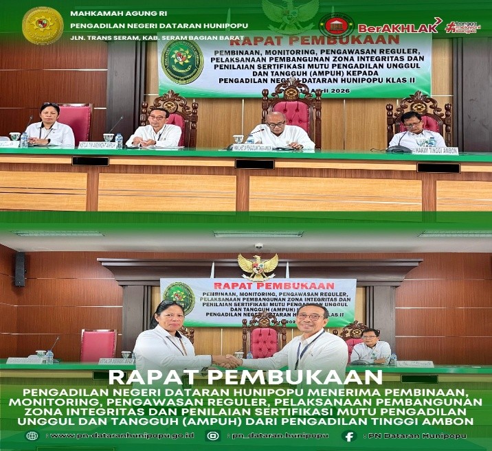 Selasa 14 April 2026, berlokasi di Jl. Trans Seram, Desa Waipirit, Kecamatan Kairatu, Kabupaten Seram Bagian Barat, Provinsi Maluku. Pengadilan Tinggi Ambon (PT Ambon) melakukan kunjungan langsung ke Pengadilan Negeri (PN) Dataran Hunipopu dalam rangka melaksanaan pembinaan, monitoring, pengawasan reguler, pelaksanaan pembangunan, zona integritas, dan penilaian sertifikasi mutu pengadilan unggul dan tangguh (AMPUH).