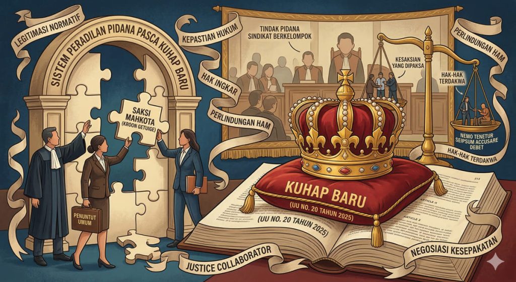 Berlakunya Undang-Undang Nomor 20 Tahun 2025 tentang Kitab Undang-Undang Hukum Acara Pidana (KUHAP Baru) telah membawa konsekuensi mendasar terhadap sistem pembuktian perkara pidana dan perlindungan hak Tersangka/Terdakwa. Salah satu isu krusial yang perlu dibahas lebih lanjut Adalah mengenai kedudukan saksi mahkota (kroon getuige) dalam pembuktian perkara tindak pidana yang bersifat sindikat, berkelompok, atau persengkongkolan, seperti kasus pembunuhan Brigadir Josua oleh Ferdy Sambo dan Richard Eliezer. Dalam pola kasus tersebut, akan ada Terdakwa (yang diperiksa dalam perkara lain) dipaksa didudukan sebagai saksi dalam perkara Terdakwa lainnya.