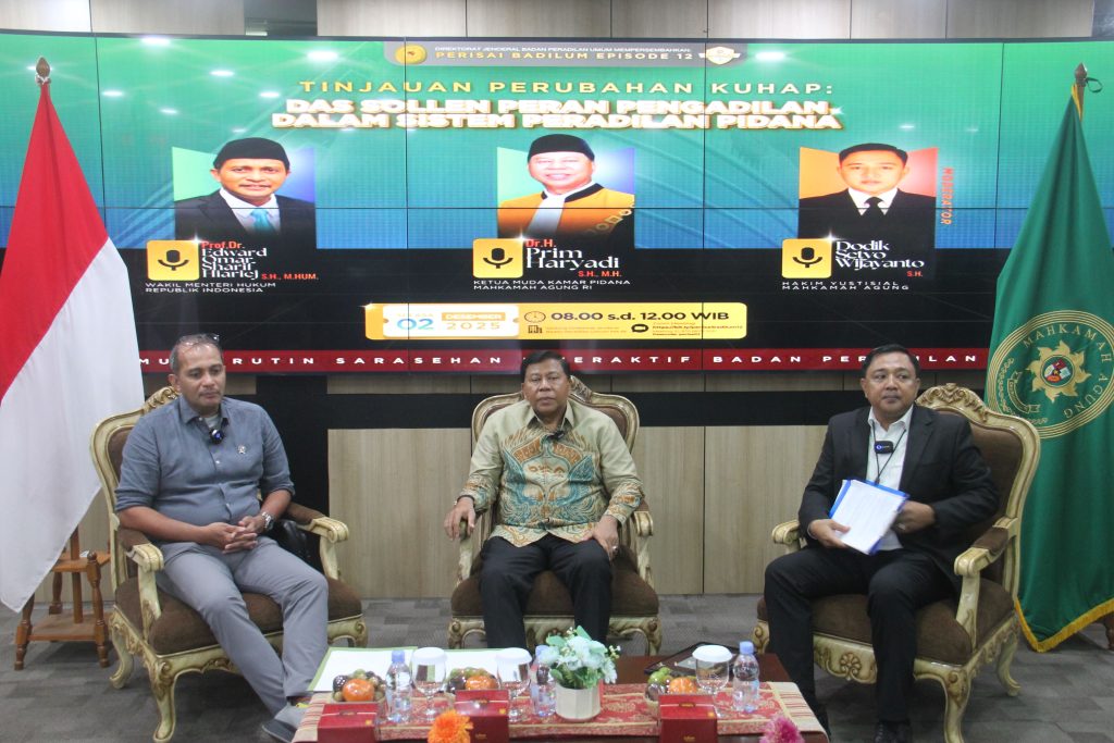 Upaya proaktif Direktur Jenderal Badilum (Dirjen Badilum) ini patut diapresiasi karena bertujuan mempersiapkan aparatur pengadilan, yang berperan sebagai garda terakhir penegakan keadilan pidana, dalam menghadapi perubahan hukum fundamental. Acara ini menampilkan narasumber terkemuka, yaitu Prof. Dr. Edward Omar Sharif Hiariej (Wakil Menteri Hukum RI) dan YM Dr. H. Prim Haryadi (Ketua Kamar Pidana MARI). Sarasehan ini diselenggarakan secara hybrid dengan kehadiran langsung di Command Center Badilum oleh YM Bapak Suradi (Hakim Agung Kamar Pidana merangkap Plt. Kabawas MARI), Dirjen Badilum beserta Jajaran, dan Hakim Yustisial, serta diikuti secara daring oleh Pimpinan, Hakim, dan Aparatur Pengadilan Tinggi dan Pengadilan Negeri se-Indonesia.