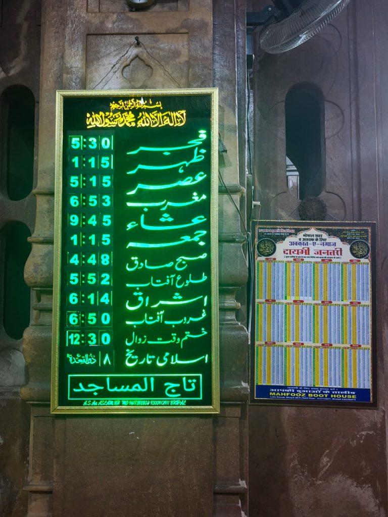 Sebagaimana lazimnya shalat berjamaah di masjid al-Maghfirah BSDK atau masjid-masjid lainnya di Indonesia, jarak antara adzan dan iqomah 12-15 menit. Hal ini diterapkan berdasarkan hadits Rasulullah: “afhdalul ‘amal ashalatu fi awwali waktiha (sebaik-baik amal itu shalat pada awal waktu). Hari itu waktu subuh di Bhopal pukul 04.23 AM dan waktu syuruk pukul 05.40 AM. Selesai muadzin mengumandangkan adzan kami melaksanakan shalat tahiyatul masjid 2 rokaat, lalu shalat qobliyah subuh (shalat fajar) 2 rokaat, kemudian kami ada yang membaca al-Qur’an, berdzikir, dsb. menunggu iqomah. Ternyata iqomah shalat subuh pukul 05.30 mendekati waktu syuruk, maka selesai mendirikan shalat subuh mataharipun merayapi bumi dan menampakan sinarnya dari upuk timur.