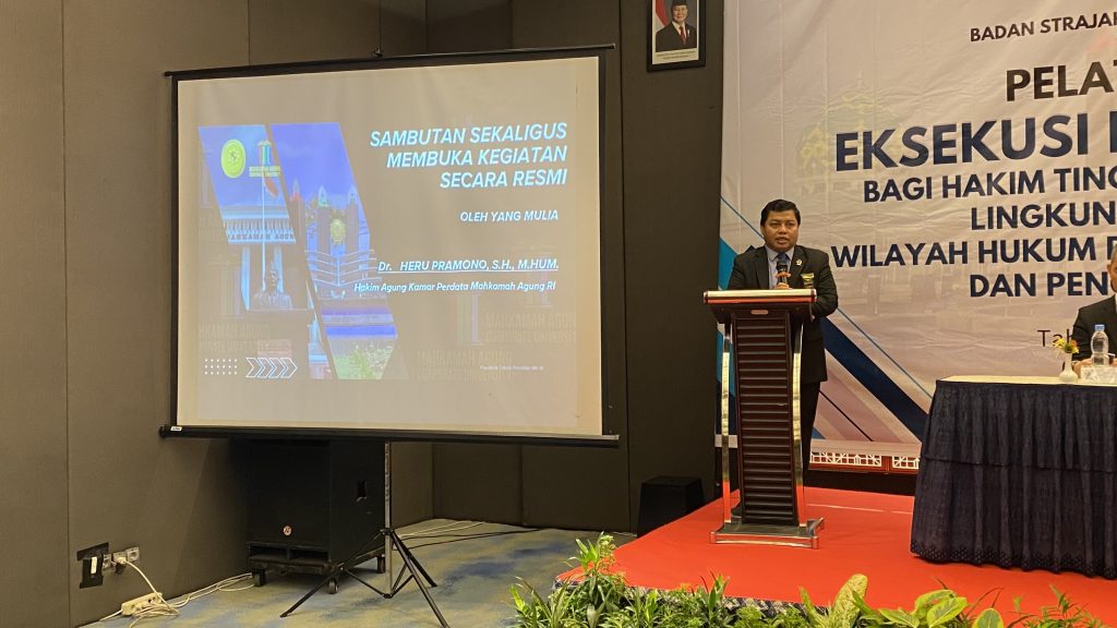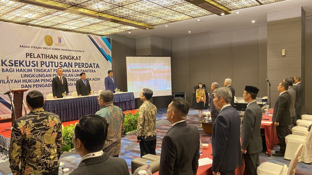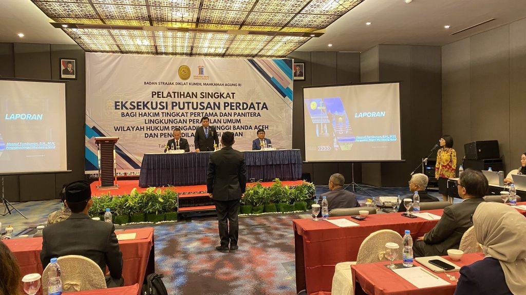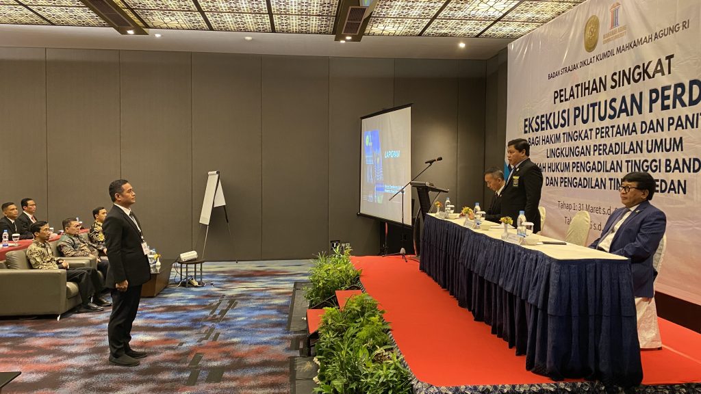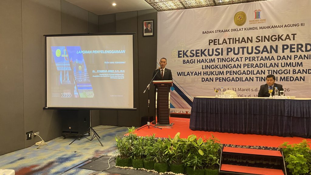 Selasa, 7 April 2026, bertempat di Grand Mercure Medan, dilaksanakan Pembukan Pelatihan Singkat (PS) Eksekusi Putusan Perdata, yang diikuti oleh Hakim dan Panitera Tingkat Pertama Peradilan Umum Wilayah Hukum Pengadilan Tinggi Banda Aceh dan Medan. Pelatihan yang akan dilaksanakan hingga 9 April 2026 ini dibuka oleh Hakim Agung Kamar Perdata, yaitu Yang Mulia Heru Pramono, S.H., M.H., dengan didampingi oleh Kepala BSDK serta Ketua Pengadilan Tinggi Medan dan dikuti oleh 40 Peserta, terdiri dari Ketua dan Wakil Ketua serta Panitera.